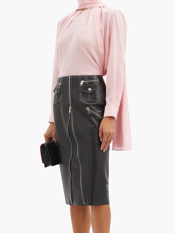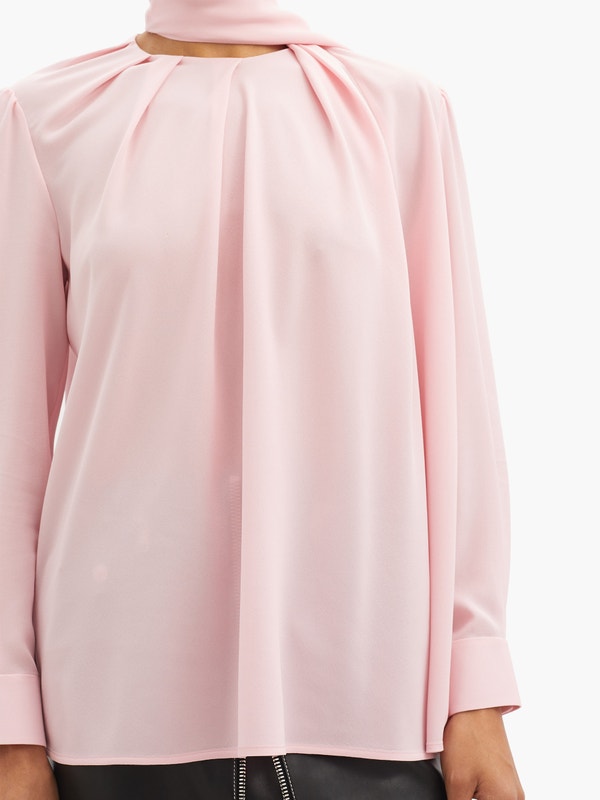 Sarah Burton’s artful approach to draping is reflected by Alexander McQueen’s pink blouse, which features a sweeping scarf tie that tumbles gently down the back. Made in Italy from silk crepe, it’s shaped with a pleated round neck and finished with a keyhole slit at the nape. Juxtapose the soft handle by tucking it into a leather skirt.