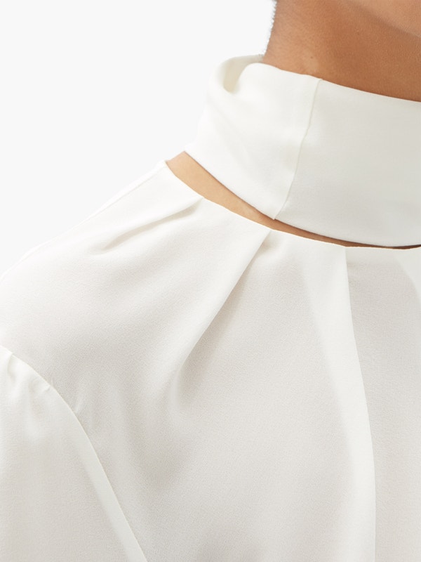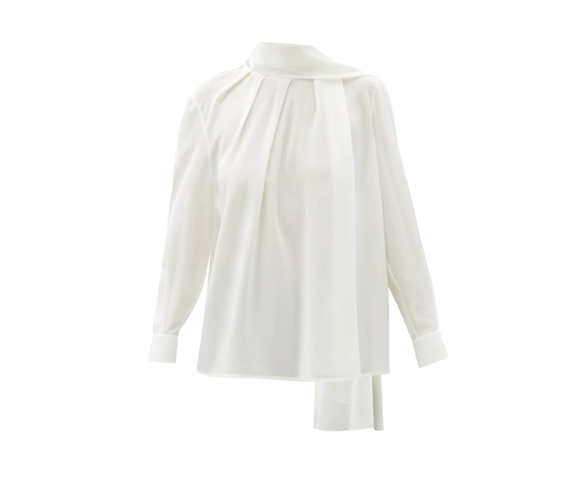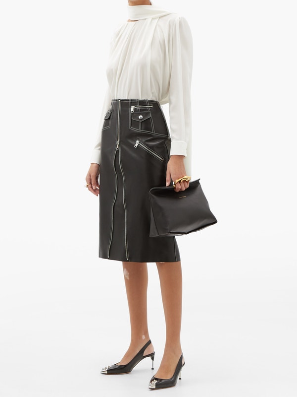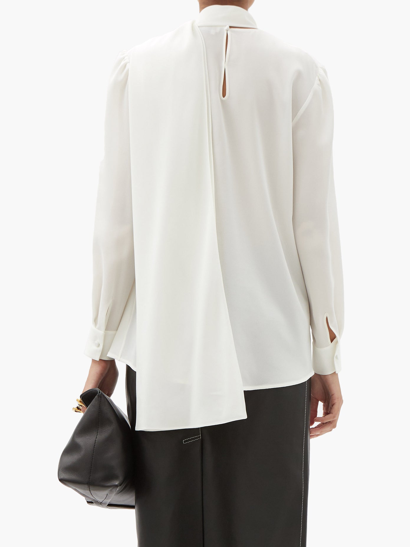 Sarah Burton’s artful approach to draping is reflected by Alexander McQueen’s pink blouse, which features a sweeping scarf tie that tumbles gently down the back. Made in Italy from silk crepe, it’s shaped with a pleated round neck and finished with a keyhole slit at the nape. Juxtapose the soft handle by tucking it into a leather skirt.