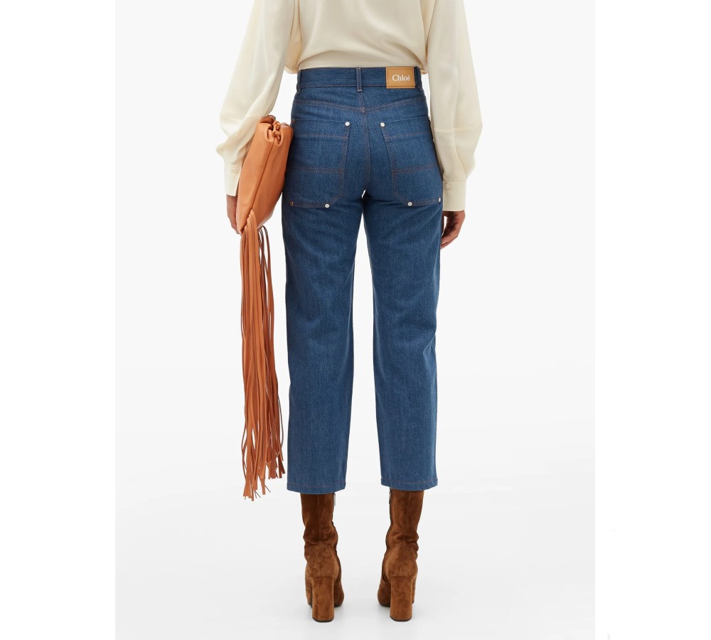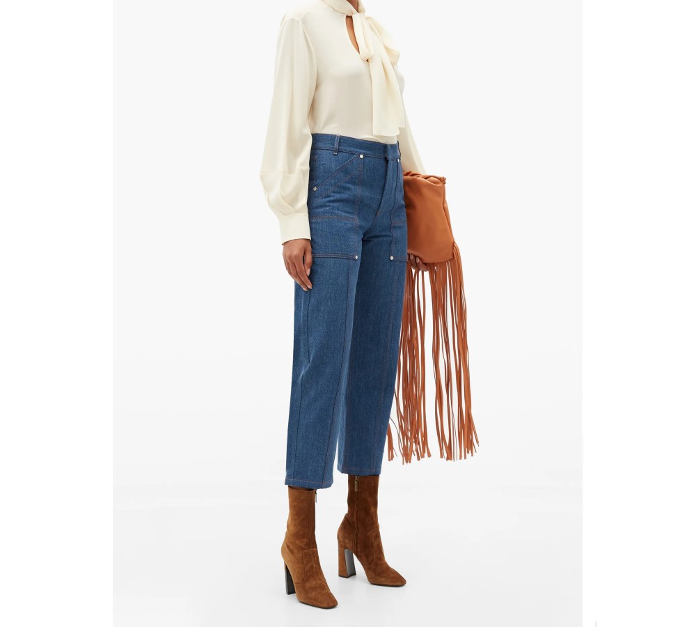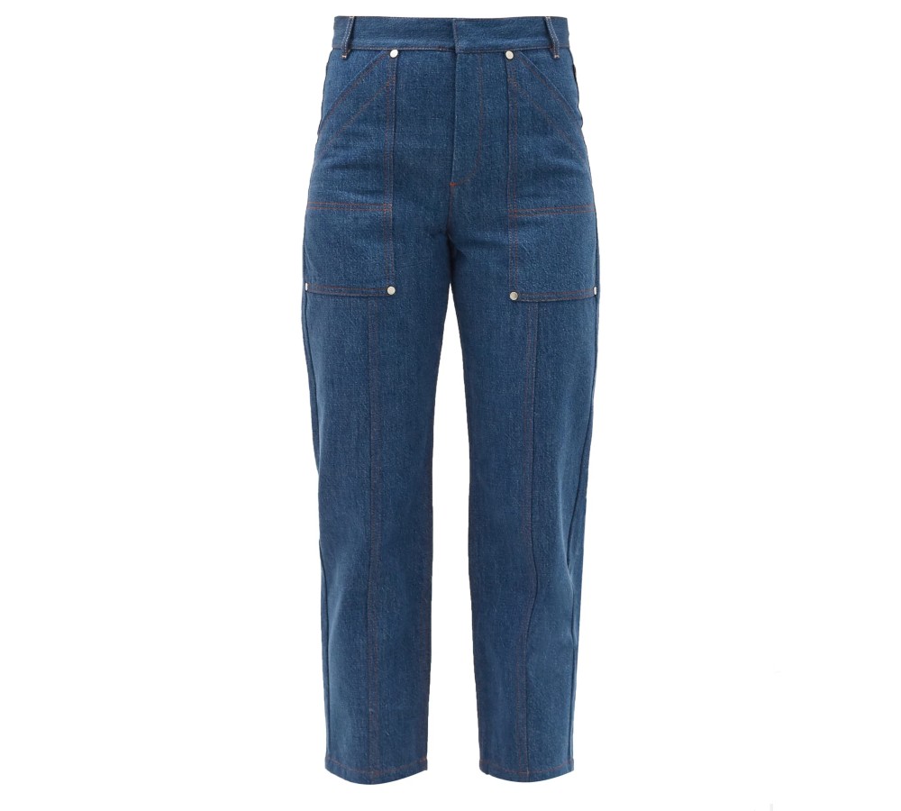 Chloé’s blue cropped jeans appear in the Pre-AW20 lookbook, balancing tailoring and knitwear ensembles with a vintage workwear feel. They’re made from rigid denim framed with orange topstitching and have large patch pockets through the straight legs. Tuck in a top to highlight the beige logo patch at the back of the high-rise waist.