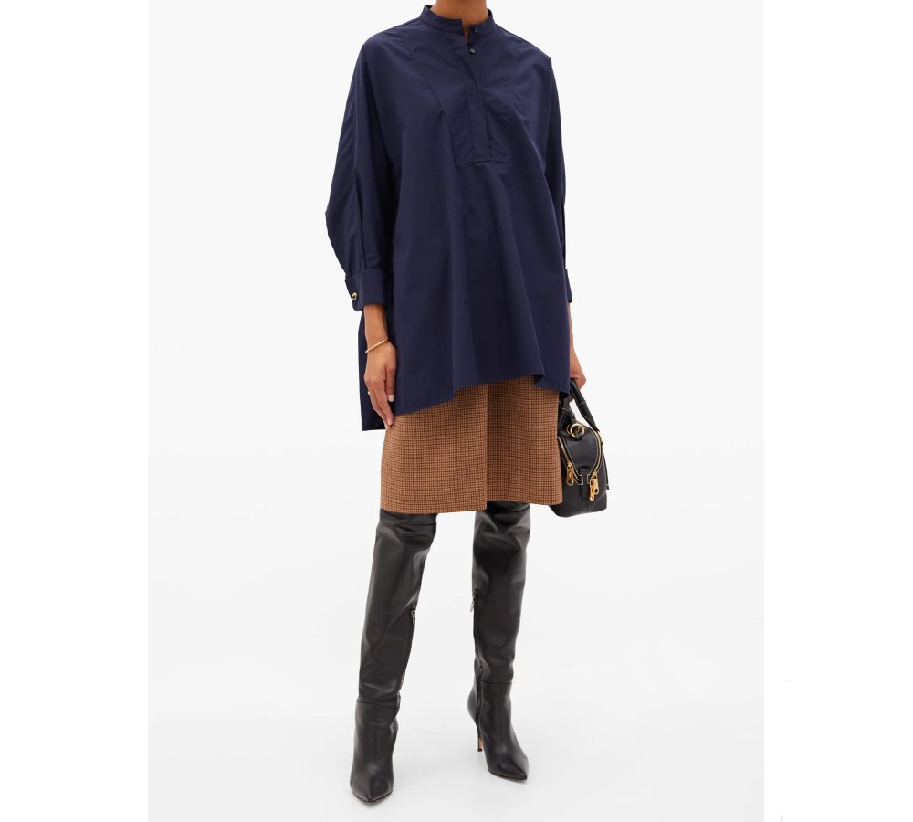 This navy shirt is seen in Chloé’s Pre-AW20 lookbook, which celebrates relaxed tailoring and seasonless wardrobe staples. It’s made from cotton poplin to a longline silhouette with cropped dolman sleeves that are secured with gold C-logo cufflinks. Layer it over a checked skirt and leather boots to emulate the collection styling.