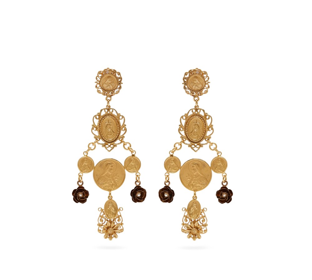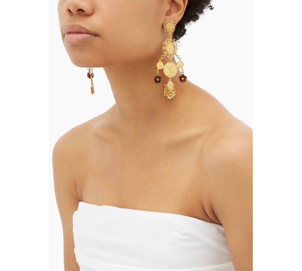 Domenico Dolce and Stefano Gabbana’s interest in religious iconography has influenced their creative practice, as demonstrated with these gold-tone brass drop earrings. They’re crafted in Italy with multiple medallions depicting various images of the Virgin Mary, which are then accompanied by faux pearl-embellished flowers and filigree ornaments. Sweep your hair back to appreciate the shoulder-grazing length above a strapless top or dress.