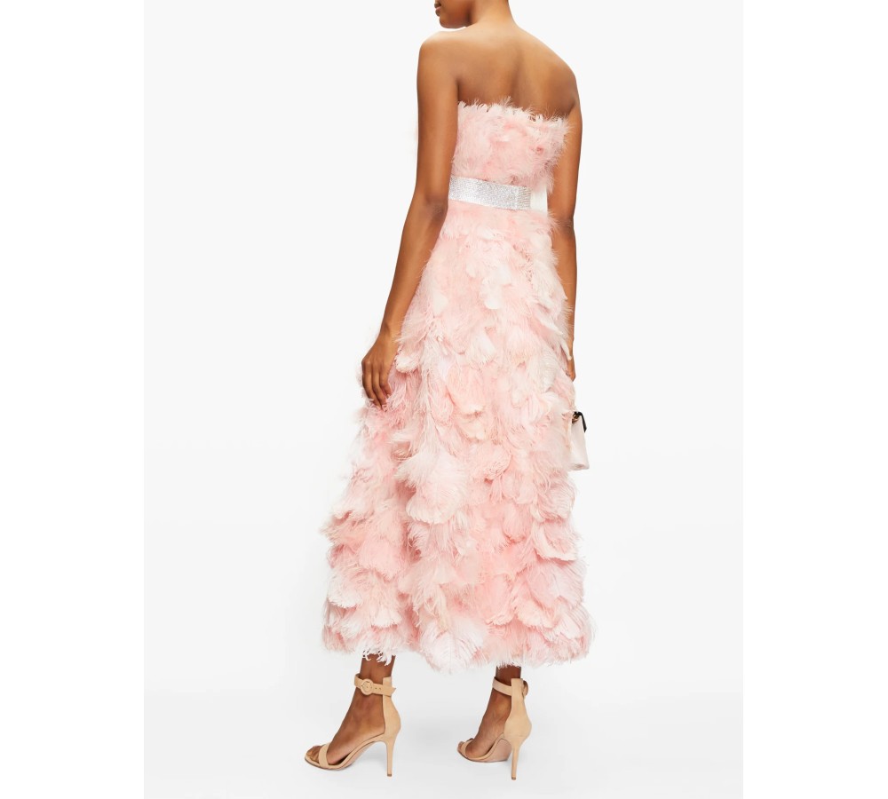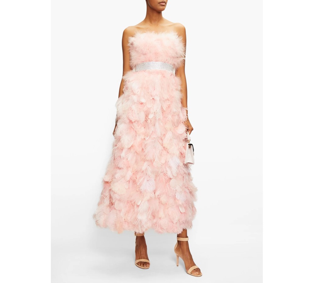 This blush-pink gown is a glamorous example of Domenico Dolce and Stefano Gabbana’s inimitable feminine vision. It’s crafted in Italy from silk organza trimmed with diaphanous feathers with are carefully arranged in layers, then defined at the waist with a sparkling crystal-embellished band. Opt for muted accessories to maintain the house’s romantic air.