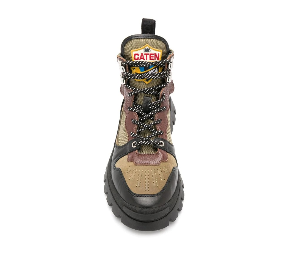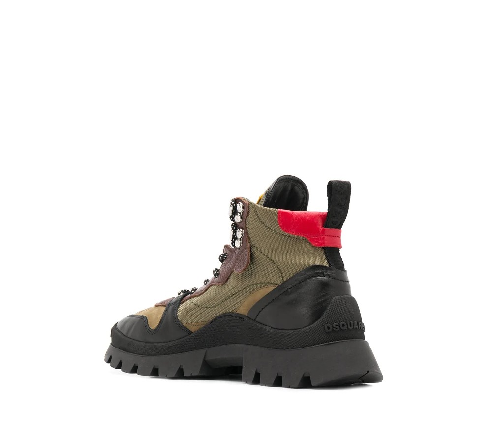 With these khaki green and black military-style ankle boots from DSQUARED2 who needs armies? You’ll be fighting your own fights. And winning them all. Hands down, no need to surrender – well, you will surrender to the boots, though. Featuring a round toe, a lace-up front fastening, a logo patch at the tongue, a pull tab at the rear, branded heel counter, a panelled design and a black ridged rubber sole.