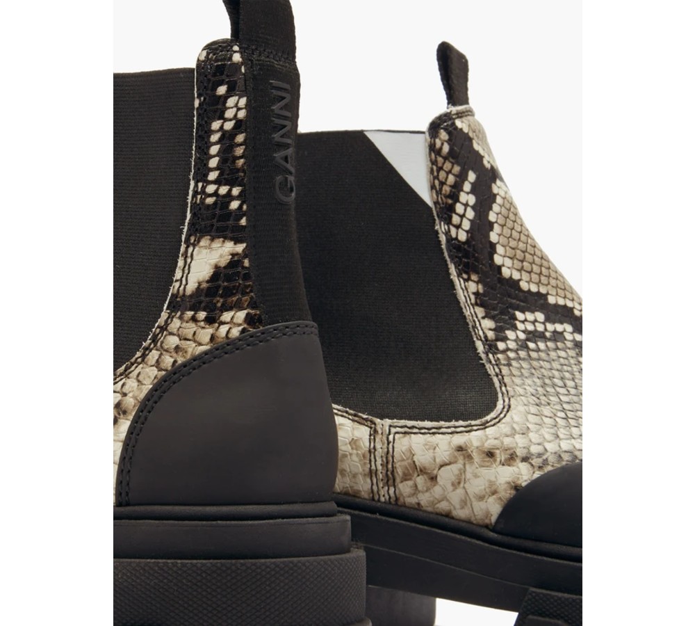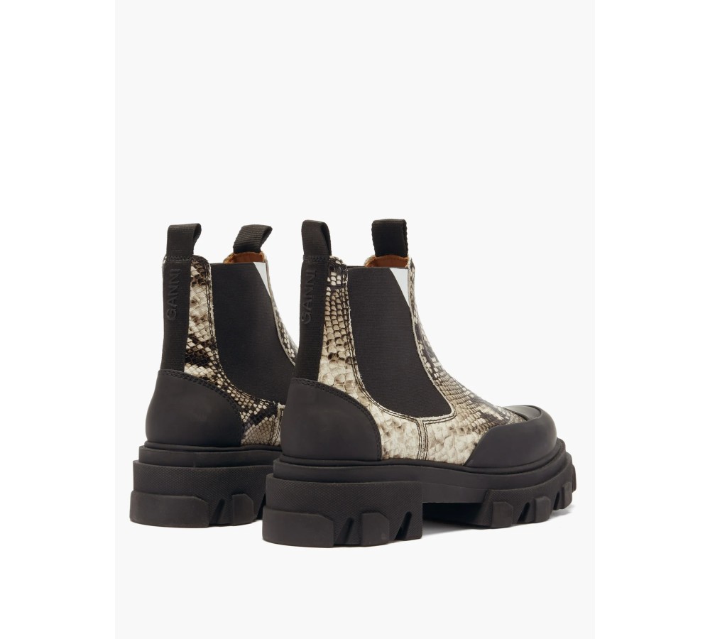 Ganni puts a modern, rugged spin on the traditional Chelsea boot silhouette with this python-effect leather pair. They have a panelled upper, pull-on tabs and traditional elasticated side panels, then are set on a flatform trek sole. Wear them as a contrast to long dresses or skirts.