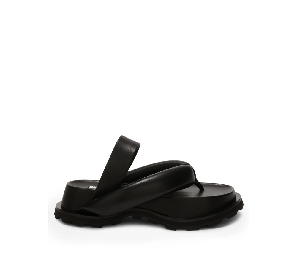 Jil Sander creative directors Luke and Lucie Meier play with proportions to create these striking black slides. Made in Italy from soft nappa leather, they feature padded thong straps and are set on a chunky rubber tread sole for a subversive look. Wear them with tonal edits for a directional flair.