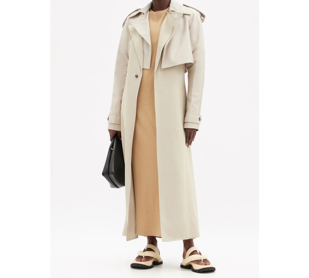 Shown here with Bottega Veneta Asymmetric leather-panelled twill trench coat, Extreme Cashmere No. 106 Weird stretch-cashmere dress, Jil Sander Goji quilted-leather clutch bag and Charlotte Chesnais Turtle 18kt gold-vermeil bracelet.