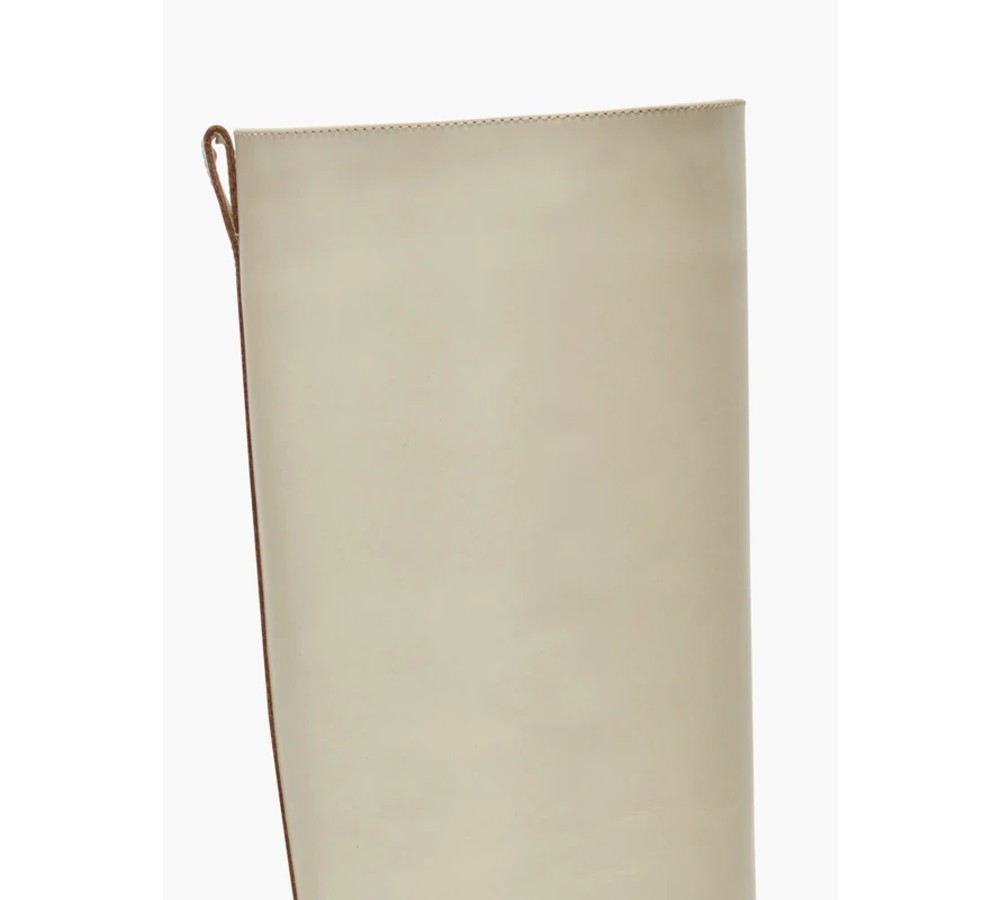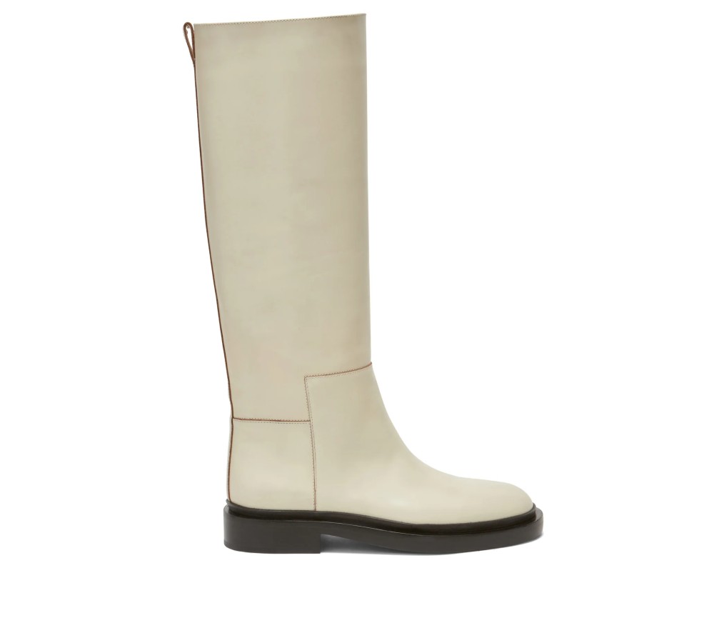 Angular panels bring a creative look to Jil Sander’s beige leather boots. They’re made in Italy and accented by a pull tab at the heel, then are set on a low black stacked leather heel and sole which extends to frame the upper, reducing the risk of scuffing. Wear them with sweaters and midi skirts throughout the cool months.