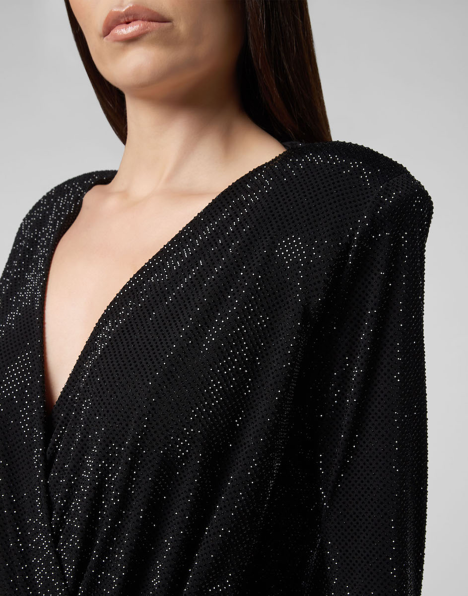 Hollywood divas’ glamour is back on this micro-rhinestone encrusted body. The plunging overlap neckline goes all the way to the stretch yarn bottom. Flouncing also on the cuffed sleeves.