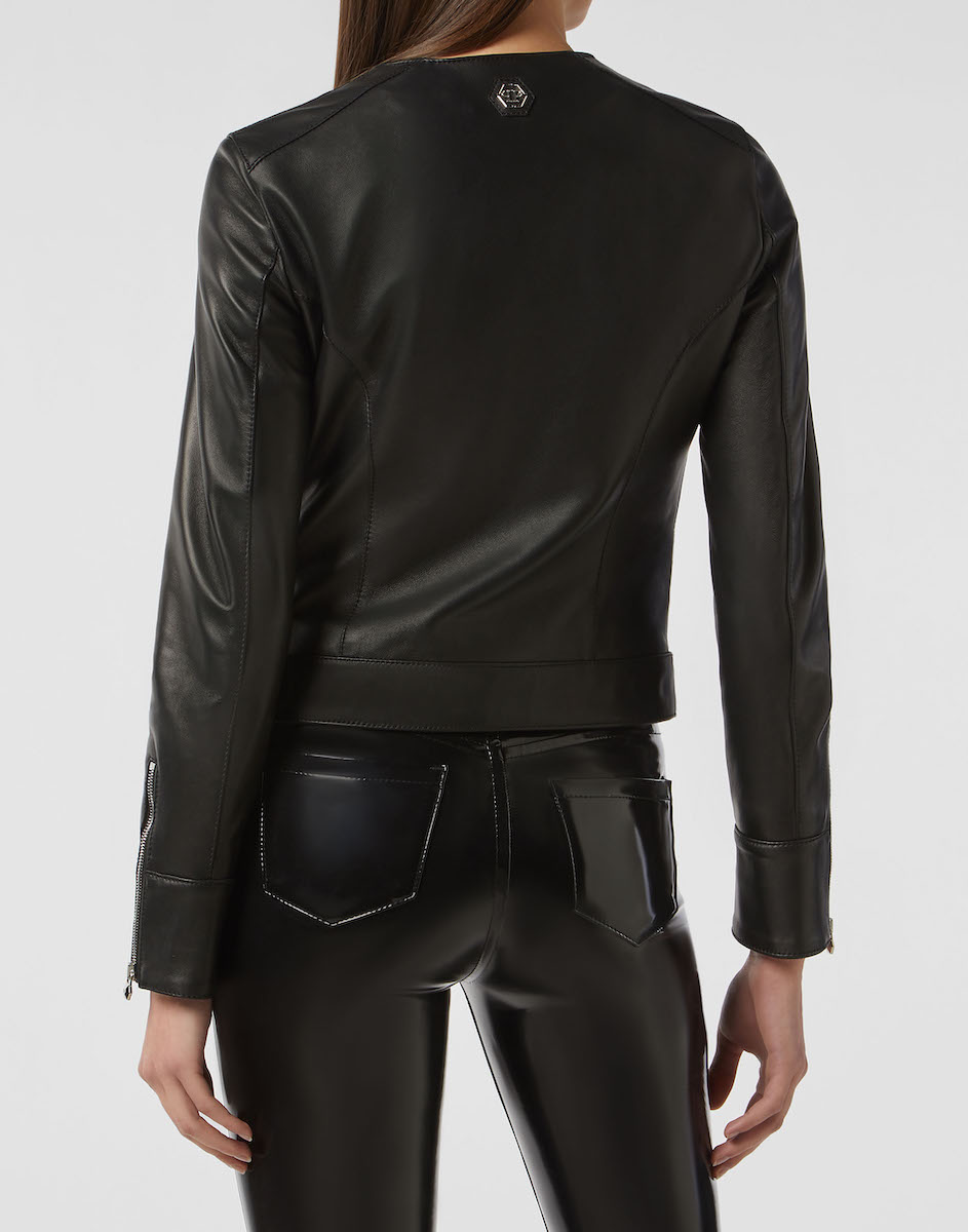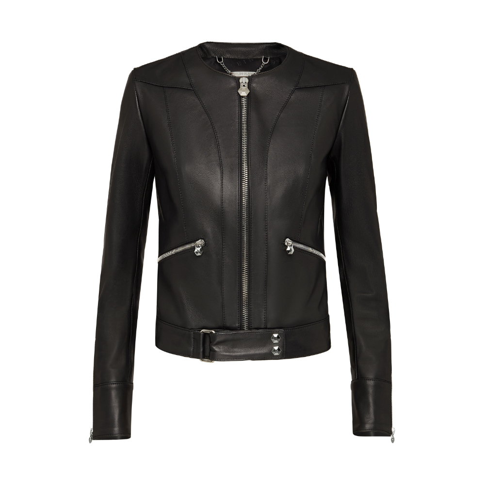 This nappa jacket features seaming and shaping that make it tight fitting. Crewneck and zipped cuffs. Zipper fastening and buckle belt at bottom hem. All-over printed inner lining.