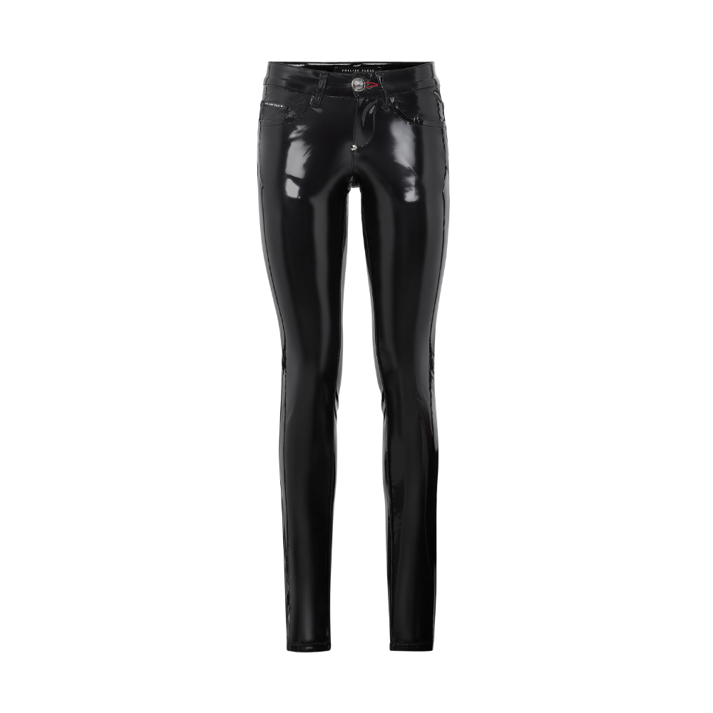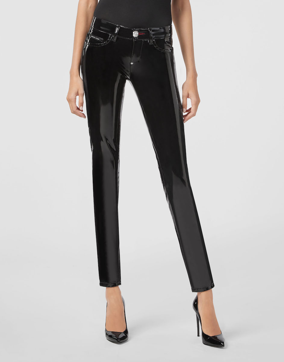 Inspired by the world of denim, these latex trousers feature the obvious 5 pockets. Metal buttoning at waist. Bottom: 29 cm