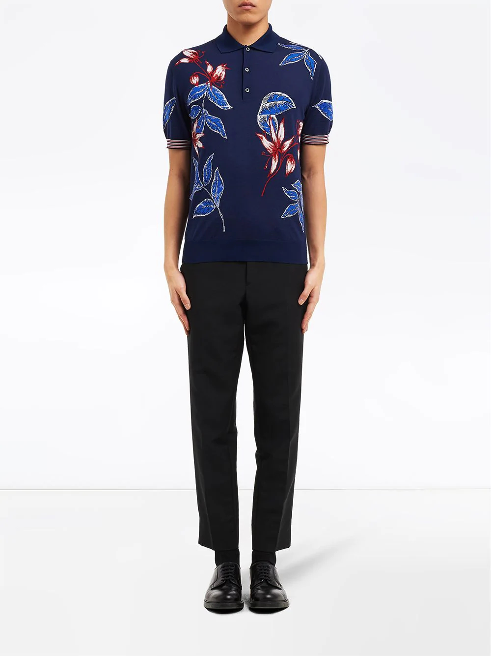 Despite the forecast, live like it’s spring. Crafted from virgin wool, this baltic blue, white and red polo shirt from Prada is decorated with a jacquard floral pattern. Happiness blooms from within… your closet! Featuring a ribbed polo collar, a front button placket, short sleeves and a ribbed hem and cuffs.