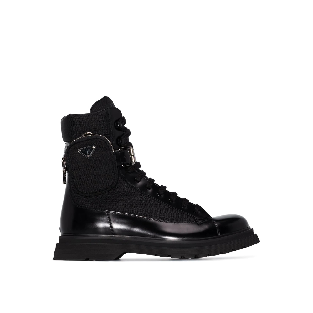 Be ready for battle or just your morning commute (same thing, right?), in these pouch-detail combat boots from Prada. Crafted with leather trim and a removable zipped pouch pocket, these lace-up pair are sure to add a polished yet rugged edge to your ensemble.