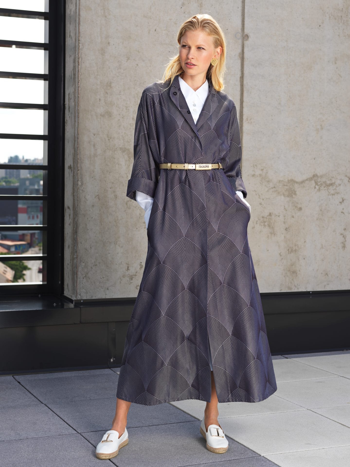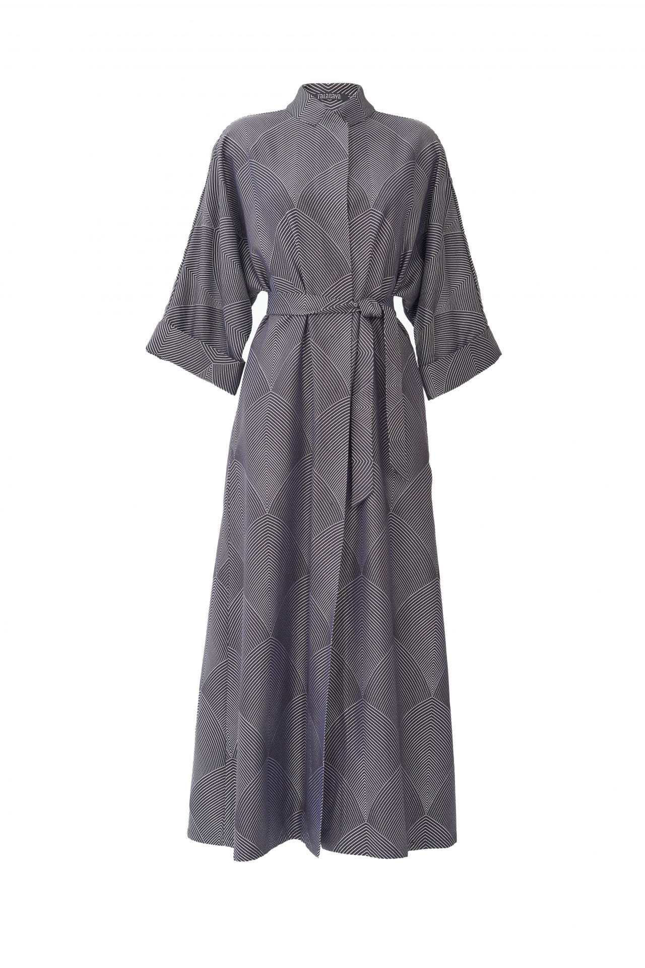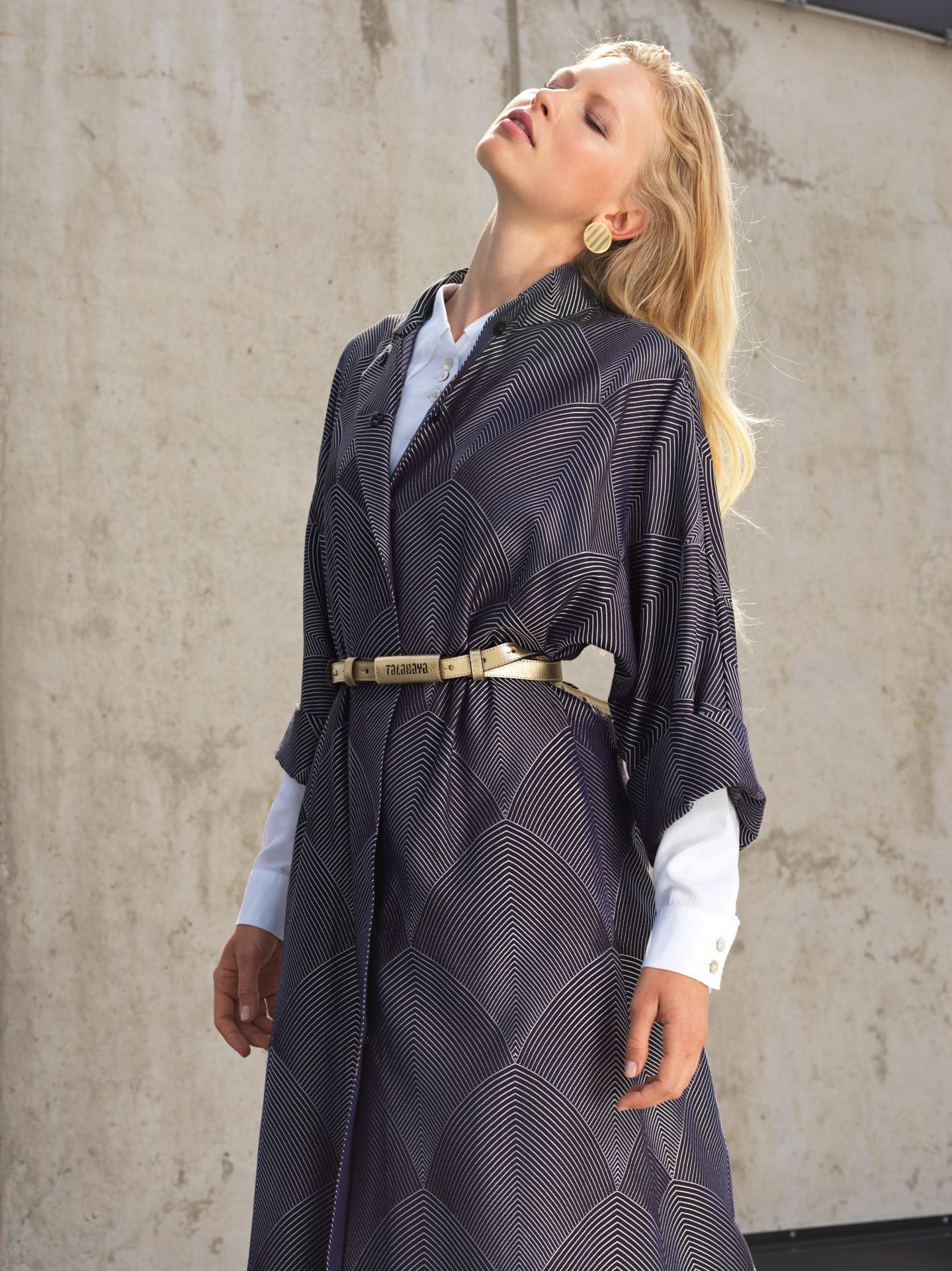 This Dahlia coat comes with a relaxed form and elegant silhouette. The Dahlia coat is made from an arc pattern´s brocade. It is a combination of a distinctive brocade pattern and a minimalist cut. It’s created with kimono-inspired sleeves and defined at the waist with a tie belt. Use the belt to cinch the loose, oversized shape. Snap-fastening is very pragmatic and also aesthetic because it does not disturb the clean appearance.