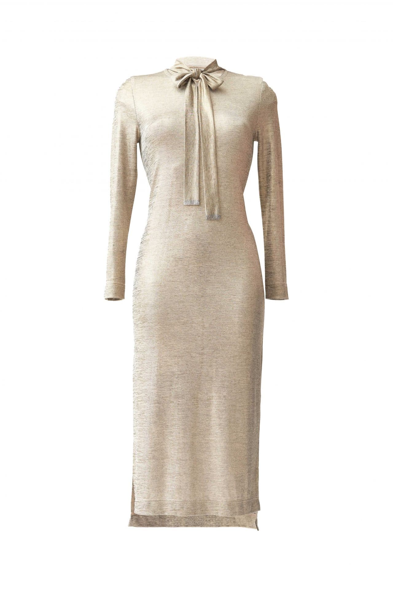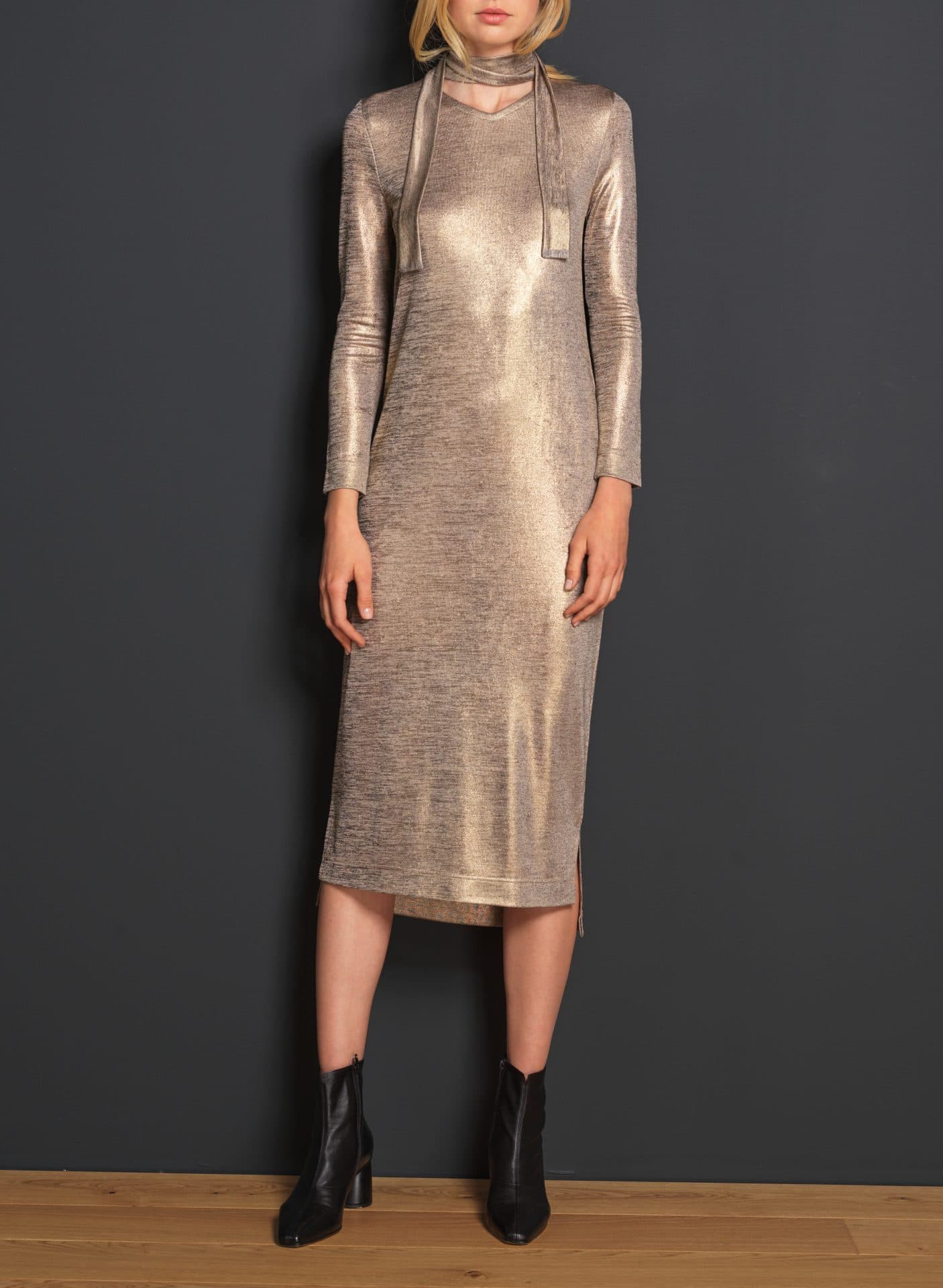 Be femme fatale and enjoy standing ovation wherever you come in this dress. Partner it with exclusive accessories for opulent styles. Serafin is made from shimmering Lurex. Leave the long neckties undone for more relaxed look or tie it. Use the belt to cinch the waist.