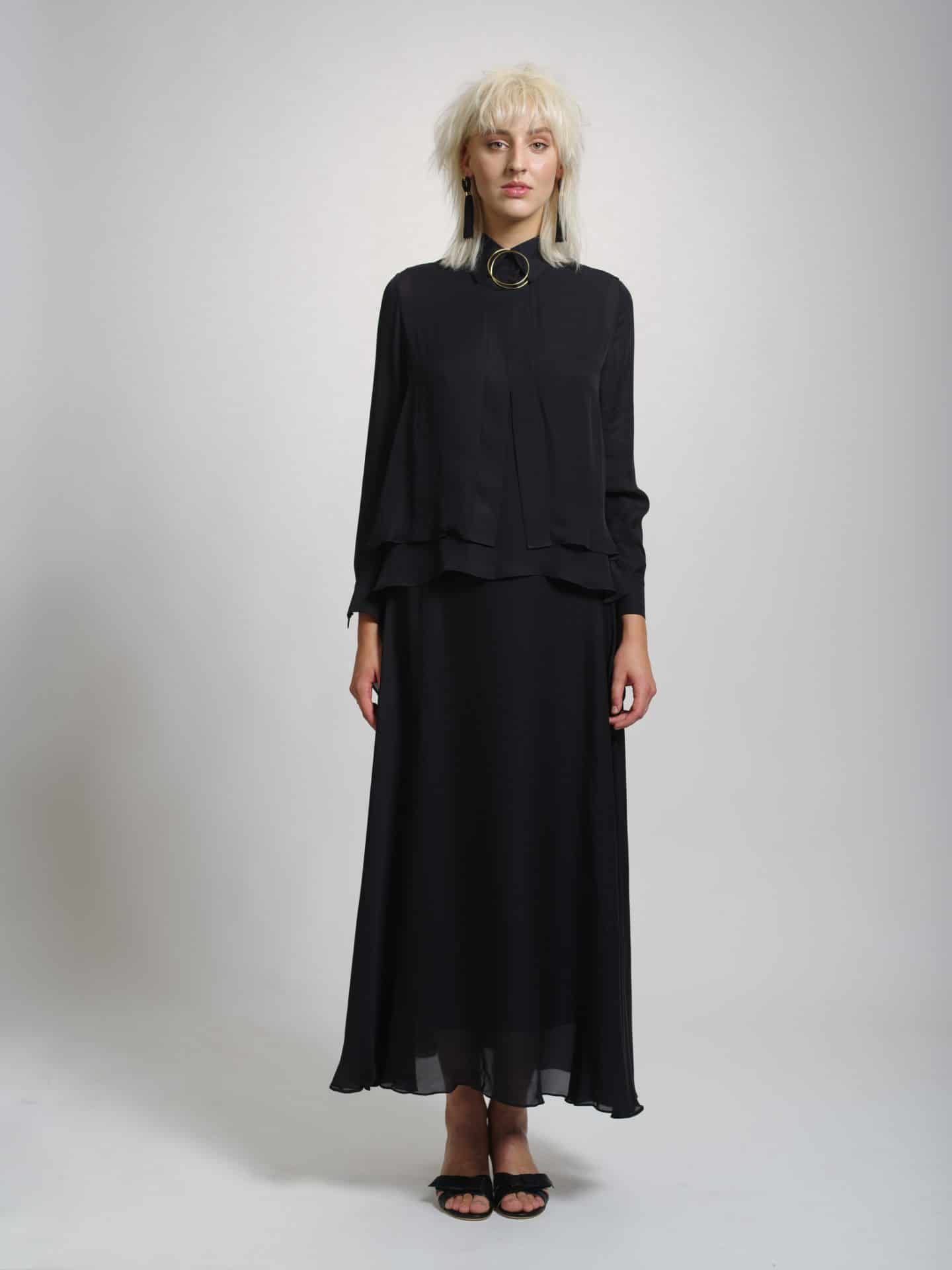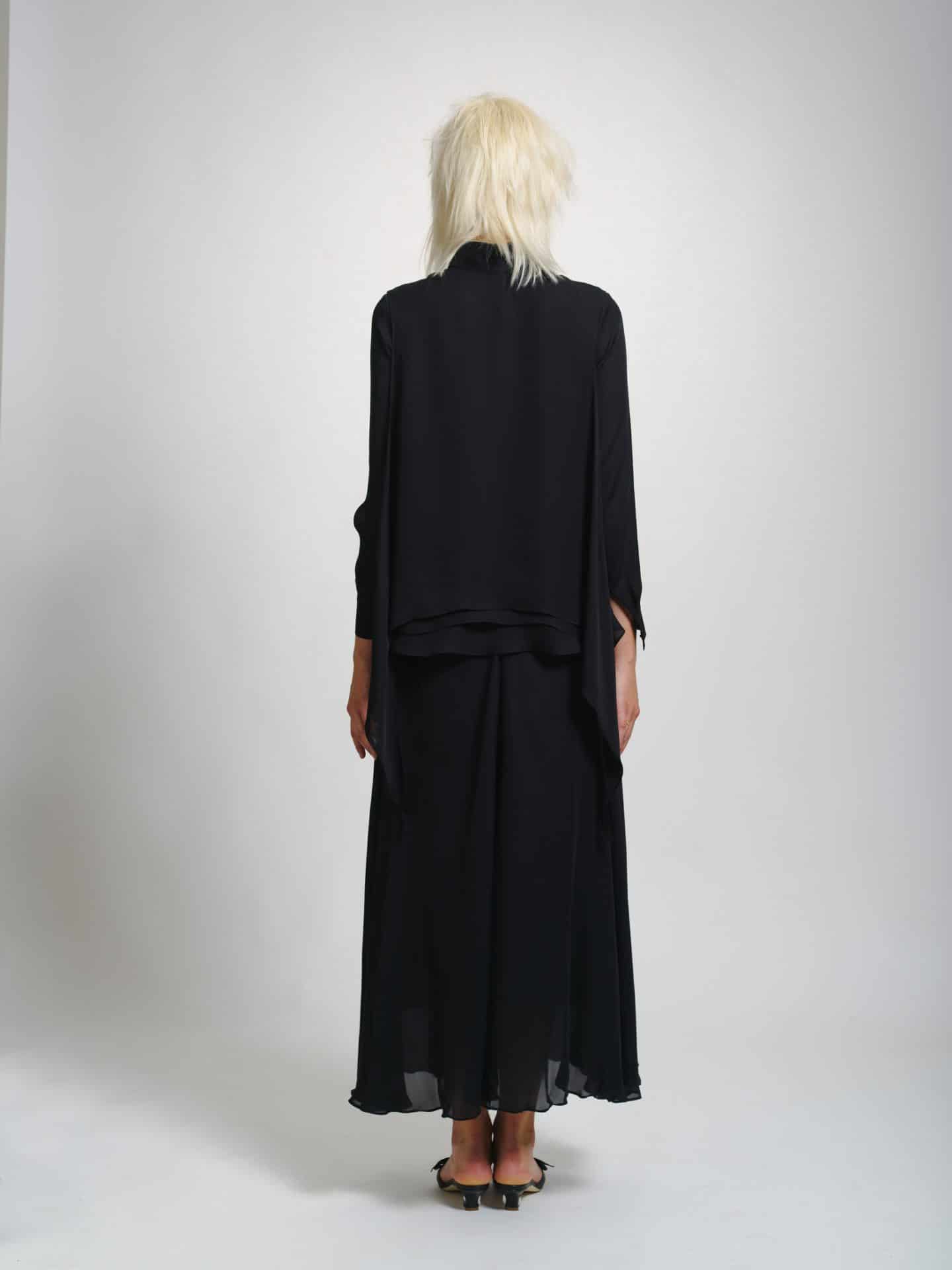 Silk shirt with veil This refined piece is designed to seamlessly fit into busy lifestyles – this silk shirt is so easy to style for the office and will look chic at after-work events, too. It’s cut for a loose fit and has a camisole underneath. The versatile veil can be used as a head wrap, scarf, belt, etc. This airy design of veil moves with you. *The shirt is sold without a skirt – the skirt is only available to bespoke order, please contact us for more information.