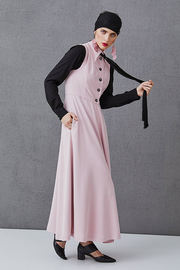 Ankle-length sleeveless “dress” with button-up top The Rosie is made from easy-care material. The upper part of the dress is embellished with a button-up front and a hidden collar through which jewellery, ribbon or other accessories can be inserted to create a sophisticated original style. The skirt´s airy design falls to an asymmetric hem, which flows as you move. Wear it layered over a Talashirt by Talabaya or simply on its own as a dress and cinch the waist with the Talabaya belt.