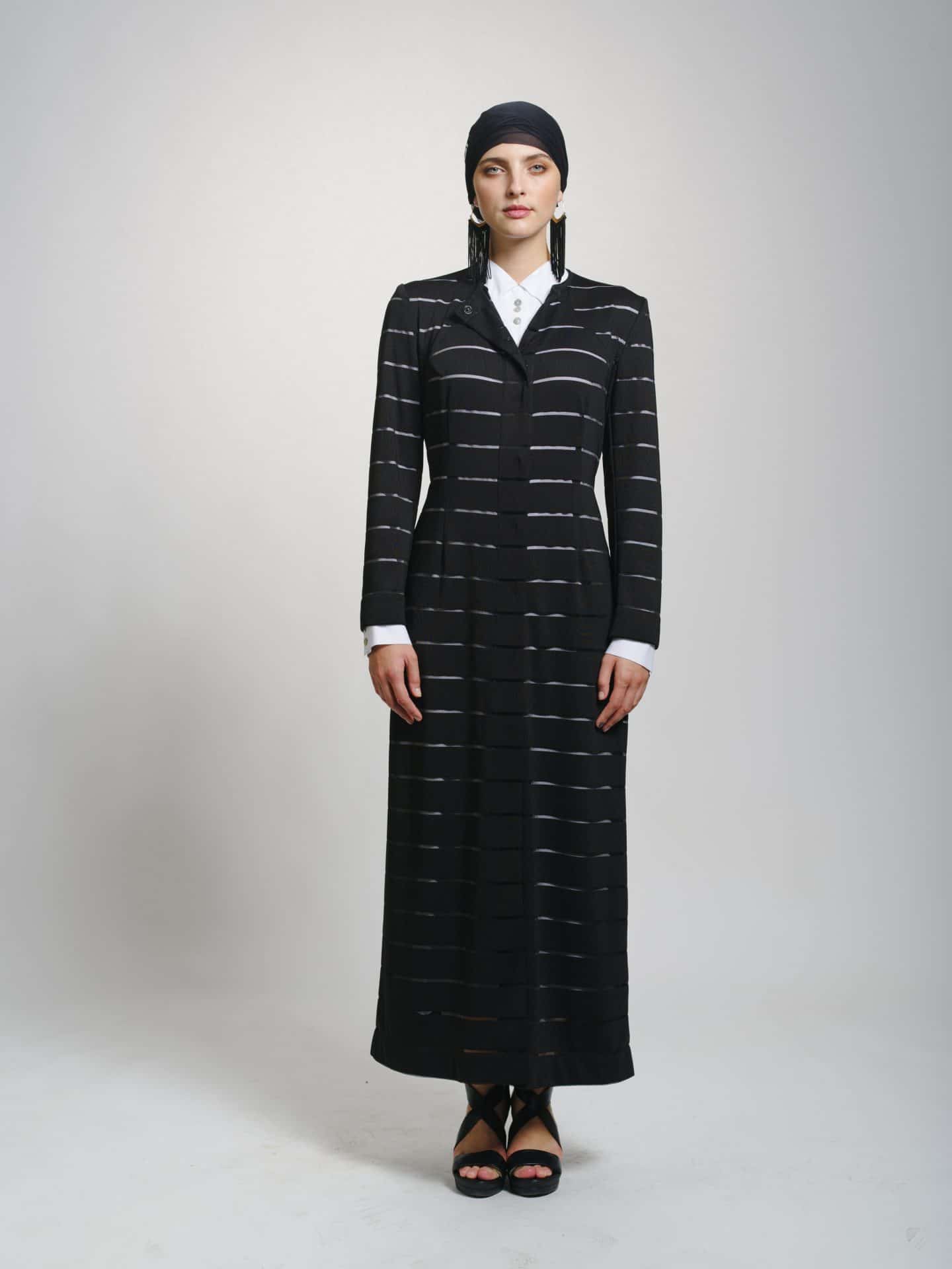 Ankle-length striped stretch coat Long coat Sara is cut from black semi-transparent striped stretch-knit material, but don´t worry, it´s designed for layering to wear with your favourite dress, pants, leggings, shirt, top or Talashirt by Talabaya. This coat has a loose, floor-sweeping silhouette. Use the belt by Talabaya to cinch in at the waist.