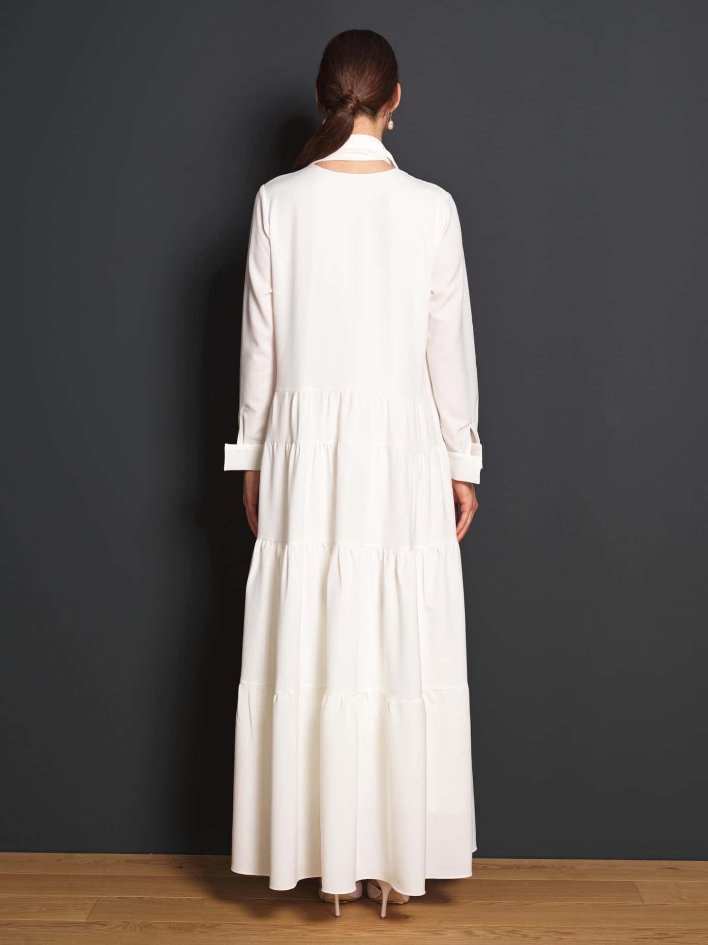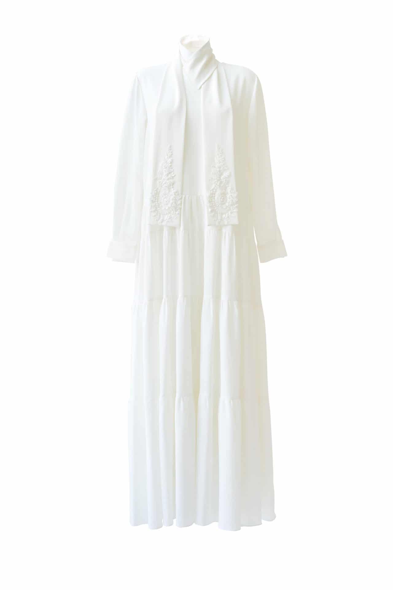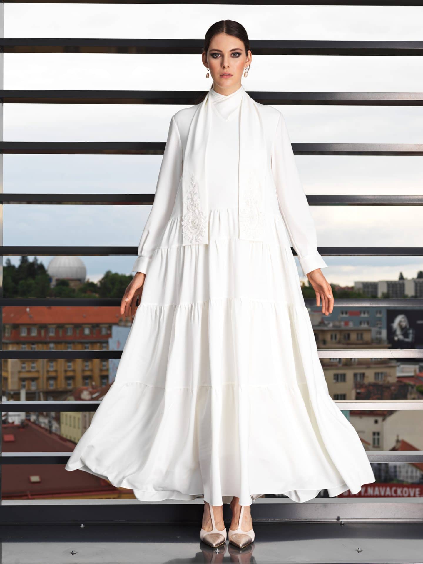LIMITED EDITION: This product can be only ordered. The dress will be made just for you. If you interest, please contact us Talabaya´s gown is such an elegant choice for the bridal event – for the big day. So romantic and feminine, it’s been made from lightweight wrinkle-resistant material and adorned outstanding embroidery. This airy dress is designed with a tiered skirt, a Lavallière collar and square snap-fastened cuffs.