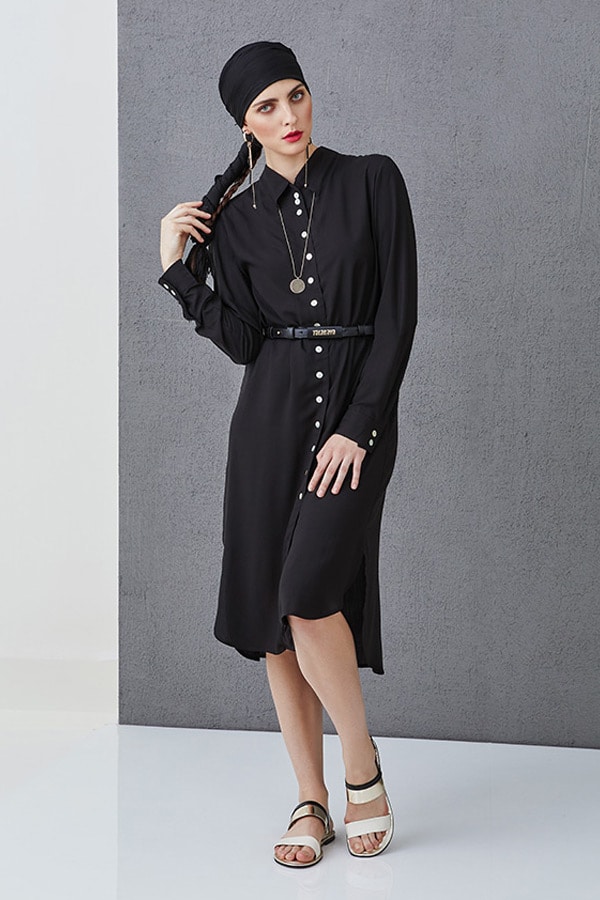 Lightweight airy viscose, very comfortable for hot Summer Slightly loose-fitting Knee-length Long sleeves Tunnel collar Square buttoned cuffs Button-down front Mother-of-pearl buttons Made in Prague