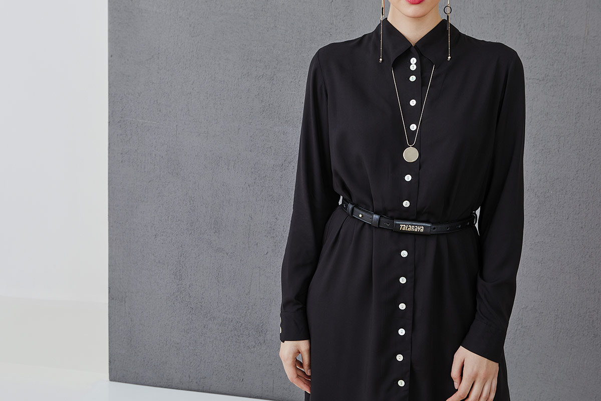 Airy shirt with tunnel collar It’s the subtle details that separate one classic shirt from another. TALASHIRT by TALABAYA is a special item for your wardrobe. Cut from loose airy viscose. It’s decorated, sophisticated and minimalistic with mother-of-pearl buttons and tunnel TALABAYA collar. Add an item of jewellery or a ribbon to create a sophisticated original style. Long sleeves finished with square buttoned cuffs. Wear under the ALIA coat or ARIANA vest, or tuck the curved hem into the waistband of your ARETHA skirt or your favourite pants or leggings. *The shirt is sold without a leather belt – add the TALABAYA BELT to your order.