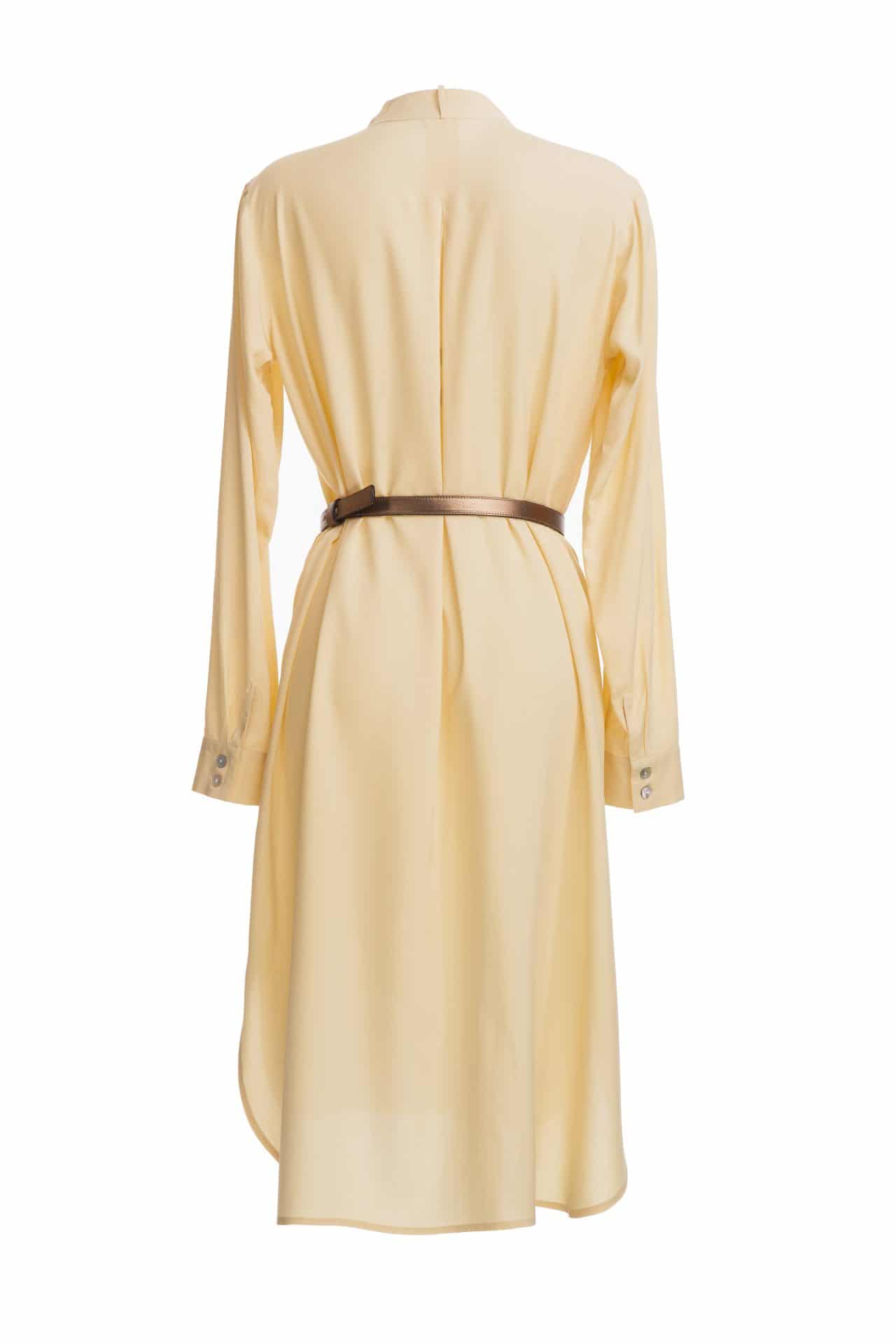 Lightweight airy viscose, very comfortable for hot Summer Slightly loose-fitting Knee-length Long sleeves Tunnel collar Square buttoned cuffs Button-down front Mother-of-pearl buttons Made in Prague